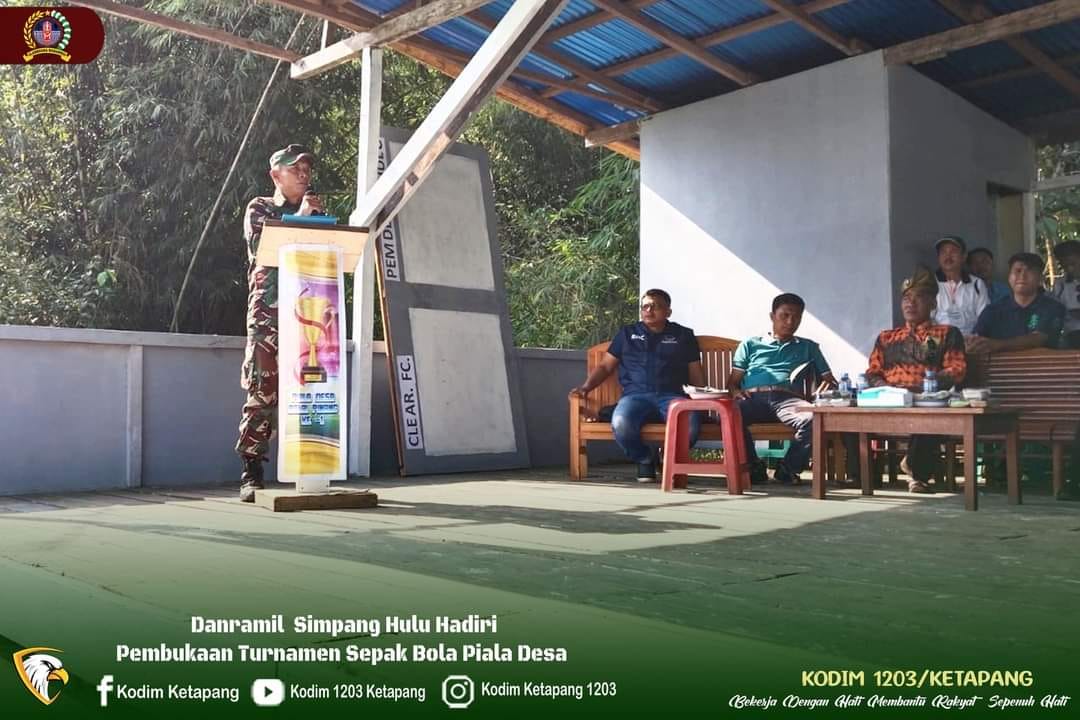 Ketapang – Danramil 1203-04/SP. Hulu, Letda Inf Sudiarto, menghadiri Pembukaan Turnamen Sepak Bola Piala Desa Tahun 2023, Tahun 2023 di Lapangan Bola Karang Taruna, Desa Balai Pinang, Kec. Simpang Hulu, Ketapang, Sabtu (2/9/2023).