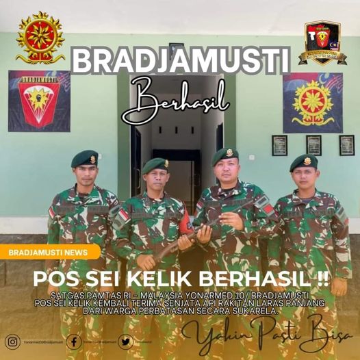 “Penyerahan satu pucuk senjata ini, suatu keberhasilan Komsos dan teritorial Satgas Pamtas Pos Sei Kelik yang membangun kepercayaan warga dengan cara ajangsana kepada masyarakat, “kata Danyon Mayor Arm Ady Kurniawan.