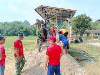 Hulu Gurung:Minggu Pagi Danramil 1206-14 Hulu Gurung Pelda Didik riyono dalam persiapan pelaksanaan Upacara peringatan HUT TNI ke 78 di lapangan sepak bola desa sejahtera kecamatan hulu gurung kabupaten kapuas hulu, (10/09/2023).