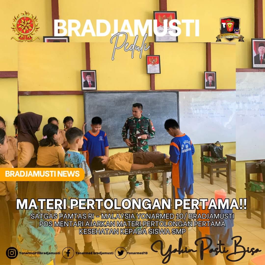 Dalam menanamkan ilmu tentang pertolongan pertama pada korban kecelakaan, Satgas Pamtas Yonarmed 10/ Bradjamusti memberikan pemahaman tentang pertolongan pertama pada kecelakaan kepada siswa-siswi SMPN 1 Badau. Di desa Badau, Kec.Badau, Kab. Kapuas Hulu, Kalbar. Selasa ( 12/09/2023)