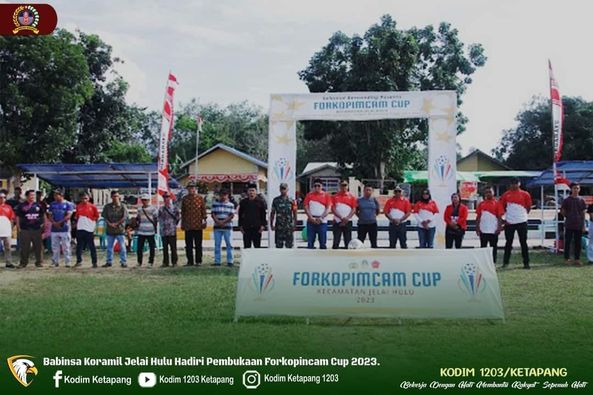 Ketapang – Kopda Rudini, mewakili Danramil 1203-14/Jelai Hulu menghadiri Pembukaan Turnamen Sepak Bola“ Forkopincam Cup 2023” di Lapangan FX Pantas Silaban, Desa Periangan, Kec. Jelai Hulu, Ketapang, Minggu (17/9/2023).