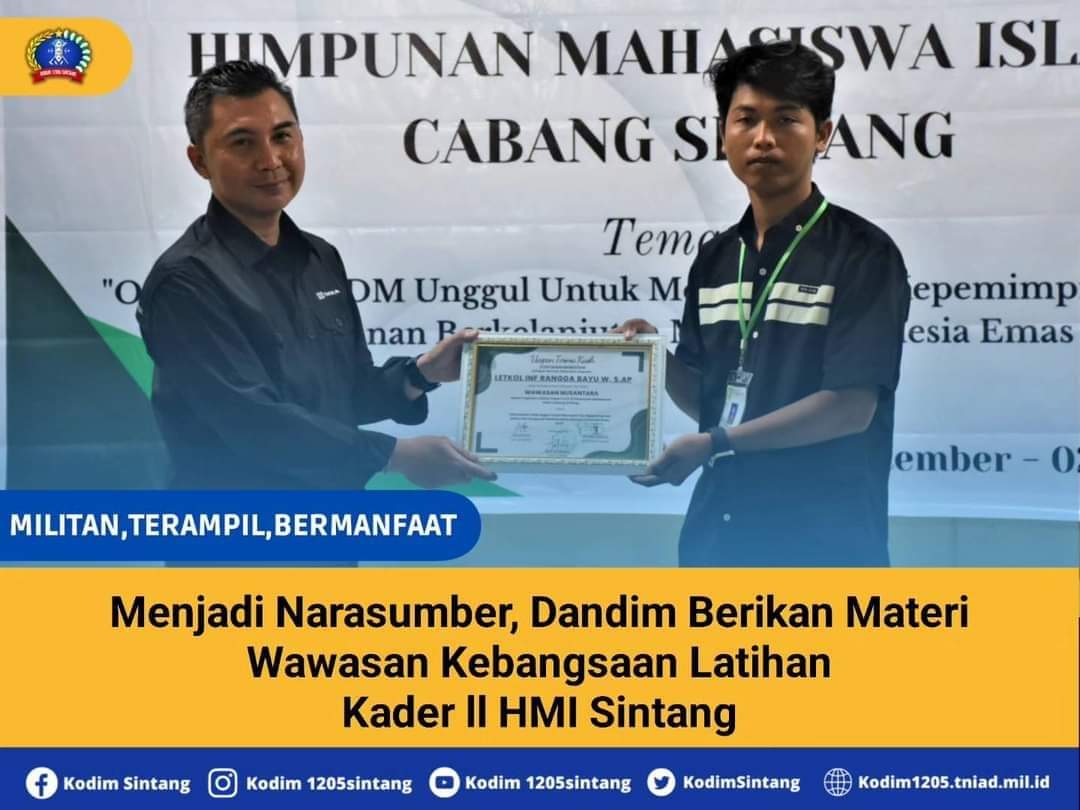 Sintang – Komandan Kodim 1205/Sintang Letkol Inf Rangga Bayu Widiartha menjadi narasumber dalam kegiatan Latihan Kader ll Himpunan Mahasiswa Islam Cabang Sintang, kegiatan yang mengangkat tema “Optimalisasi SDM Unggul untuk mencapai Visi kepemimpinan dalam pembangunan berkelanjutan menuju Indonesia Emas” ini dilaksanakan di Aula Cadika Sintang, Jum’at malam (29/09/2023).