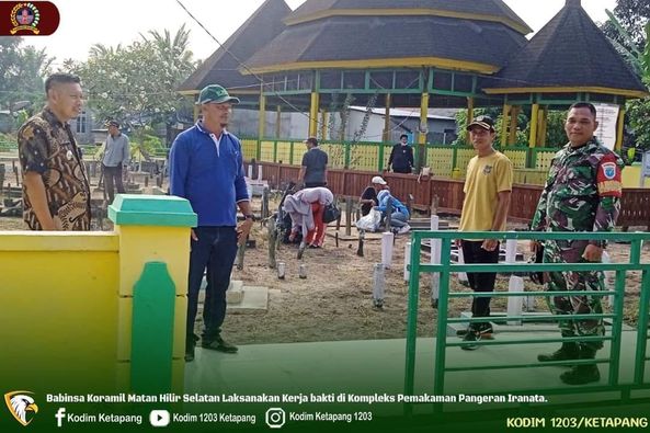Dukung Kegiatan Napak Tilas 2023, Babinsa Koramil Matan Hilir Selatan Turut Kerja bakti Di Kompleks Pemakaman Pangeran Iranata.