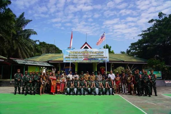 Kedatangan Danrem 121/Abw bersama rombongan Staffnya diawali dengan tarian adat selamat datang serta potong pantan (Bambu) dan disambut oleh Dansatgas Mayor Arm Andreas Prabowo Putro, S.I.Pem, M.I.P, M.Han. beserta jajaran Perwira dan anggota Satgas serta pejabat Forkopimcam dan Kepala Instansi vertikal wilayah Entikong.