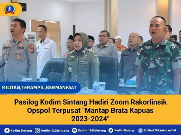 Sintang – Pasilog Kodim 1205/Sintang, Lettu Inf Perry Rajagukguk menghadiri kegiatan Zoom Rakorlinsik OpsPol Terpusat “Mantap Brata Kapuas 2023-2024”, di Aula BKPM Polres Sintang, Rabu (11/10/2023).