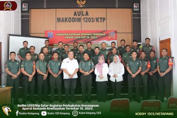 Ketapang – Guna mewujudkan kekuatan wilayah pertahanan aspek darat yang tangguh, Kodim 1203/Ktp menggelar kegiatan Peningkatan Kemampuan Aparat Komando Kewilayahan Tersebar TA. 2023 dengan tema “Melalui Kegiatan Peningkatan Kemampuan Apkowil Tersebar Kita Tingkatan Profesionalisme Diera Milenial Dan Digitalisasi Dalam Rangka Mendukung Pembangunan Nasional” di Aula Makodim 1203/Ketapang. Rabu (11/10/2023).