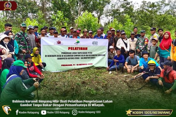 Kayong Utara – Dalam rangka mendukung pencegahan kebakaran hutan dan lahan, Babinsa Koramil 1203-11/Sph mengikuti Pelatihan pengelolaan lahan gambut tanpa bakar dengan pemanfaatnya – (PLTB) di Desa Penjalaan, Kec. Simpang Hilir, Kab. Kayong Utara, Kamis (12/10/2023).