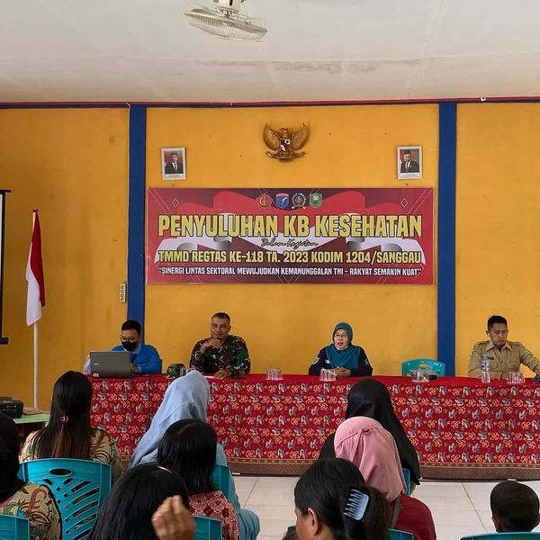Sanggau – Untuk mewujudkan keluarga sehat, bahagia dan sejahtera, Satgas TMMD Ke 118 Kodim 1204 / Sanggau gandeng Puskesmas Meliau laksanakan penyuluhan KB Kesehatan kepada masyarakat. Bertempat di aula Desa Kunyil, Senin(16/10/2023).