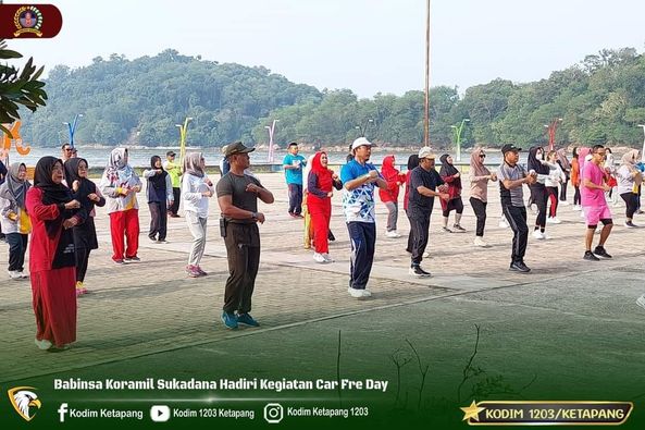 Kayong Utara – Danramil Sukadana diwakili oleh Serda Efendi Babinsa Koramil 1203-02/Skd meghadiri kegiatan “Senam Sehat Bersama” dalam rangka menggalakkan Olah Raga Rekreasi dan Car Fre Day berlokasi di Plataran Tugu Sail Karimata Pantai Pulau Datok, Kec. Sukadana, Kayong Utara. Minggu (15/10/2023).
