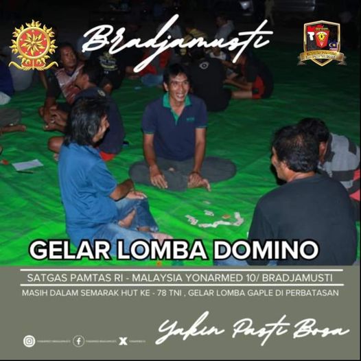 Memeriahkan HUT Ke-78 TNI, Satgas Pamtas RI – Malaysia Yonarmed 10/ Bradjamusti mengelar Lomba domino/gaple yang dipusatkan di Terminal Badau, Kecamatan Badau, Kabupaten Kapuas Hulu, Kalbar. Minggu (15/10/2023)