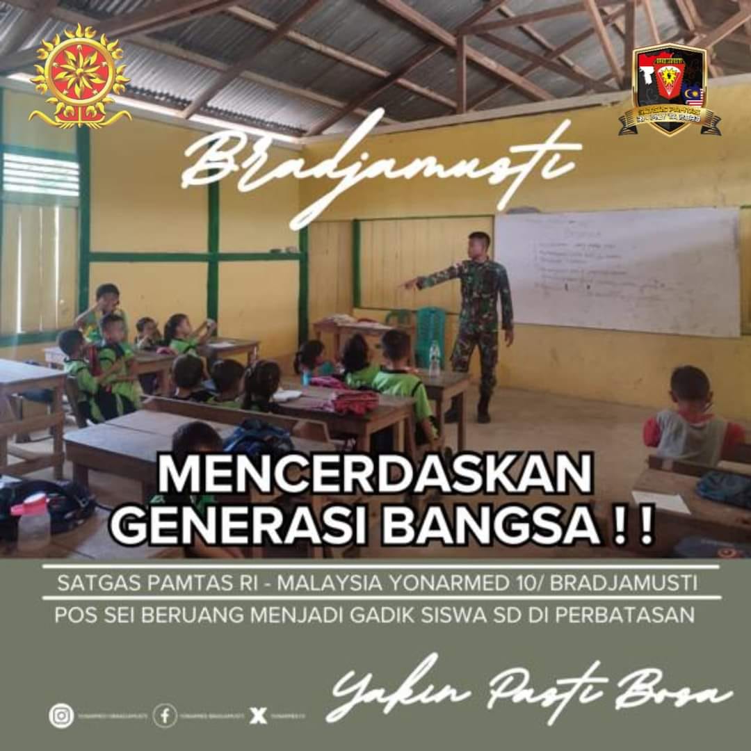 “Demi membantu sekolah dasar di Dusun Sungai Beruang yang kekurangan tenaga pendidik, Personel Pos Sei Beruang yaitu Sertu Samsul dan Serda Dean menjadi guru bantu di sekolah tersebut untuk memberikan pelajaran,” katanya.