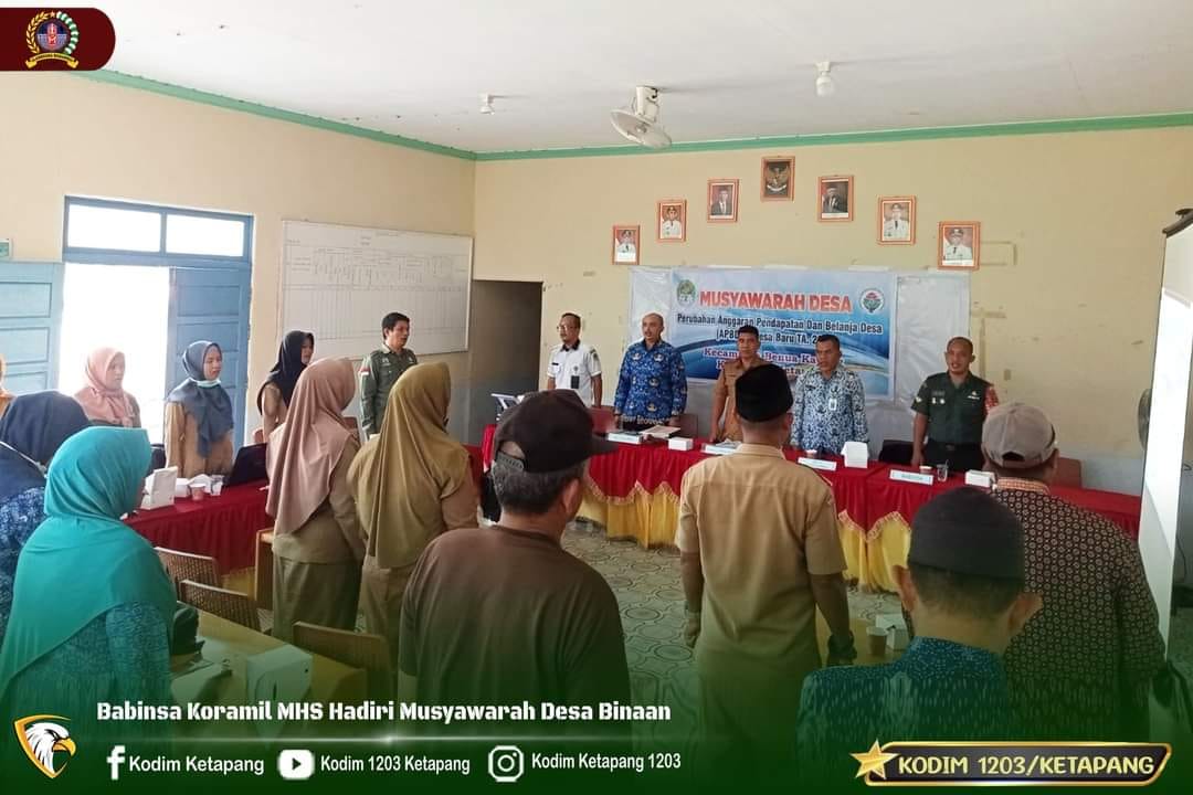 Ketapang – Sertu Andi Ahmad, Babinsa Koramil 1203-13/Mhs menghadiri kegiatan Musyawarah Desa (perubahan Anggaran Pendapatan dan Belanja Desa) Tahun 2023 di Gedung Serbaguna Jalan Pangeran Hidayat, Desa Baru, Kec. Benua Kayong, Ketapang. Kamis (19/10/2023).