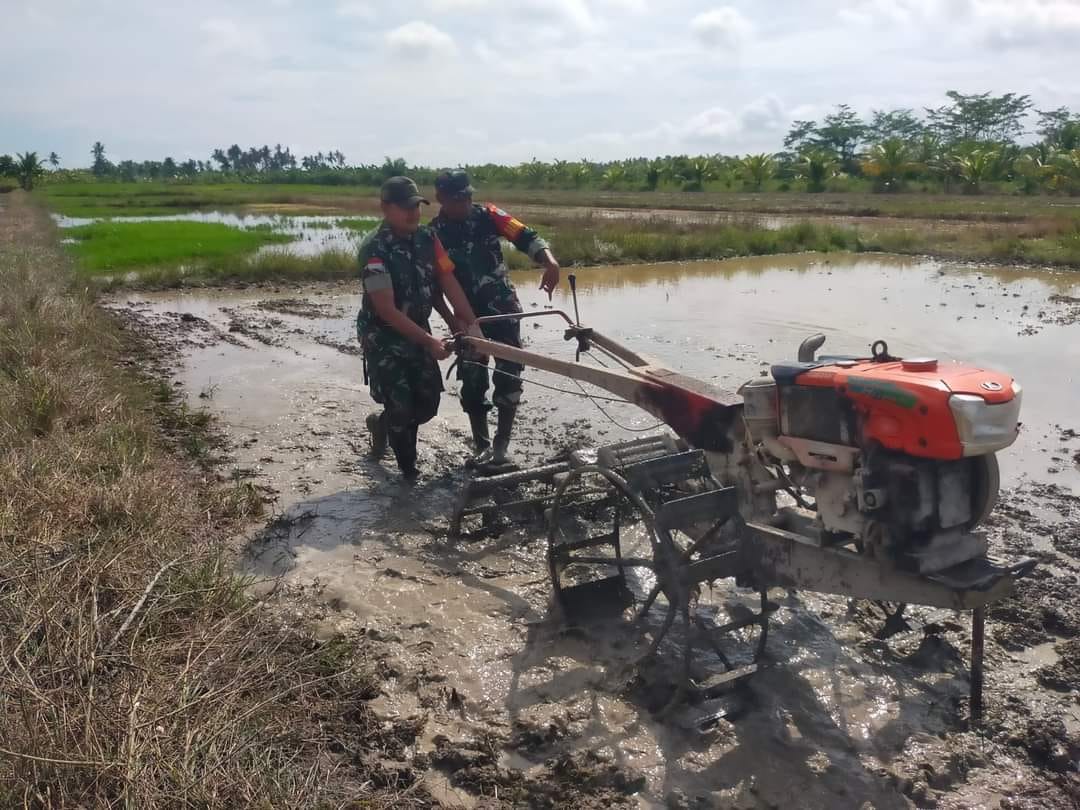 Perkuat Hanpangan PJ Danramil 04/Jawai Beserta Anggota Turun Bajak Sawah Dan Bantu Petani Tanam Padi.