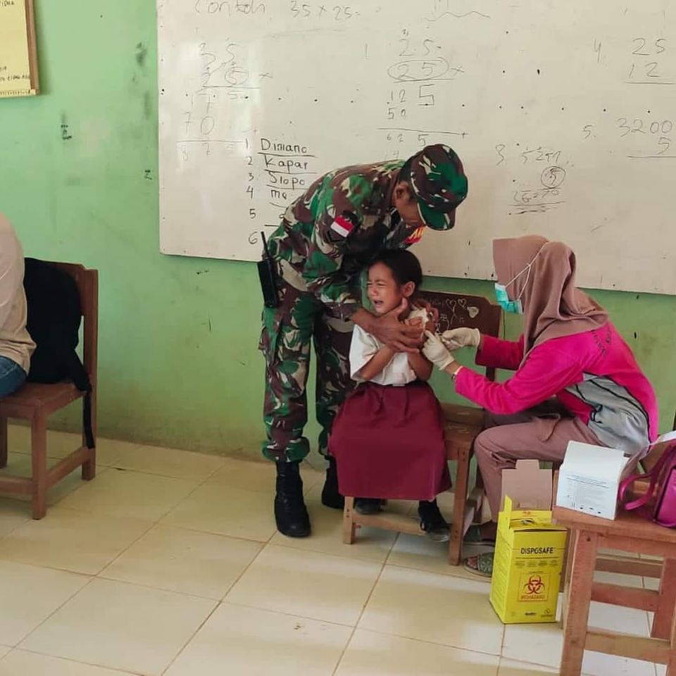Sekadau – Babinsa Koramil 1204 – 18 / Nanga Mahap Serda Supardan mendampingi petugas kesehatan memberikan Vaksin Japanese Encephalitis (JE) SDN 07 Sebabas Desa Sebabas Kecamatan Nanga Mahap Kabupaten Sekadau.Kamis (02/11/2023)