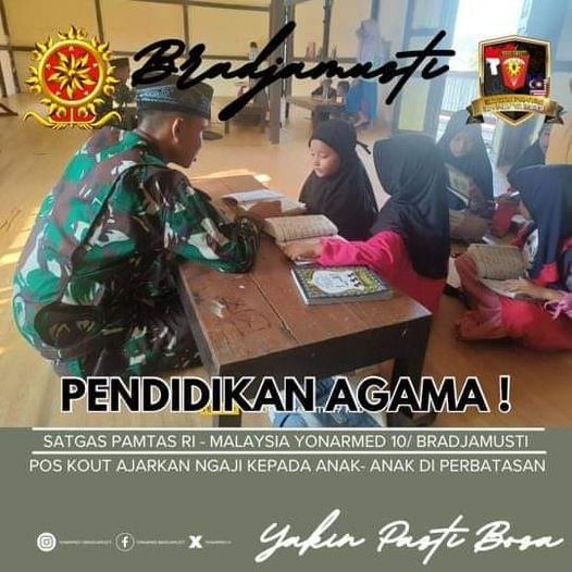 Dalam keterangan tertulis Penerangan Satgas, 3 orang Anggota Pos Kout Satgas Pamtas Ri-Mly Yonarmed 10/Bradjamusti di pimpin oleh Pabintal Satgas Pamtas RI -MLY Yonarmed 10/ Bradjamusti Letda Arm Agung Triyachin turun langsung sebagai tenaga pendidik untuk mengajarkan membaca Al-Qur’an, hapalan surat pendek dan hapalan Do’a di TPQ Thoriqul Jannah di Desa Senaning, Kec. Ketungau Hulu, Kab. Sintang, Kalimantan Barat.