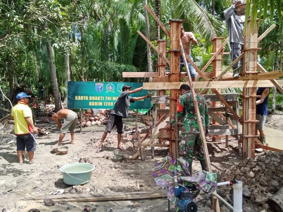 Sambas – Karya Bakti TNI Manunggal Air dengan sasaran pembuatan sumur bor 1 unit dan Tower air 1 unit tinggi 3 M, di wilayah Kodim 1208/Sambas yang berlokasi di dusun Tengah Desa Sentebang Kec. Jawai Kab. Sambas, sudah pada tahap pengecoran tiang tower.