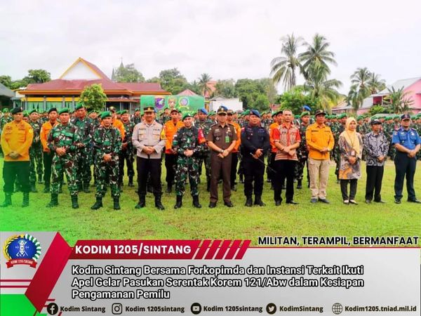 Sintang – Kodim 1205/Sintang yang dipimpin langsung Komandan Kodim Sintang Letkol Inf Rangga Bayu Widiartha Bersama Forkopimda dan sejumlah pimpinan OPD serta Instansi terkait ikuti Apel Gelar Pasukan Serentak Korem 121/Abw dalam rangka kesiapan pengamanan Pemilu 2024, Kamis (09/11/2023).