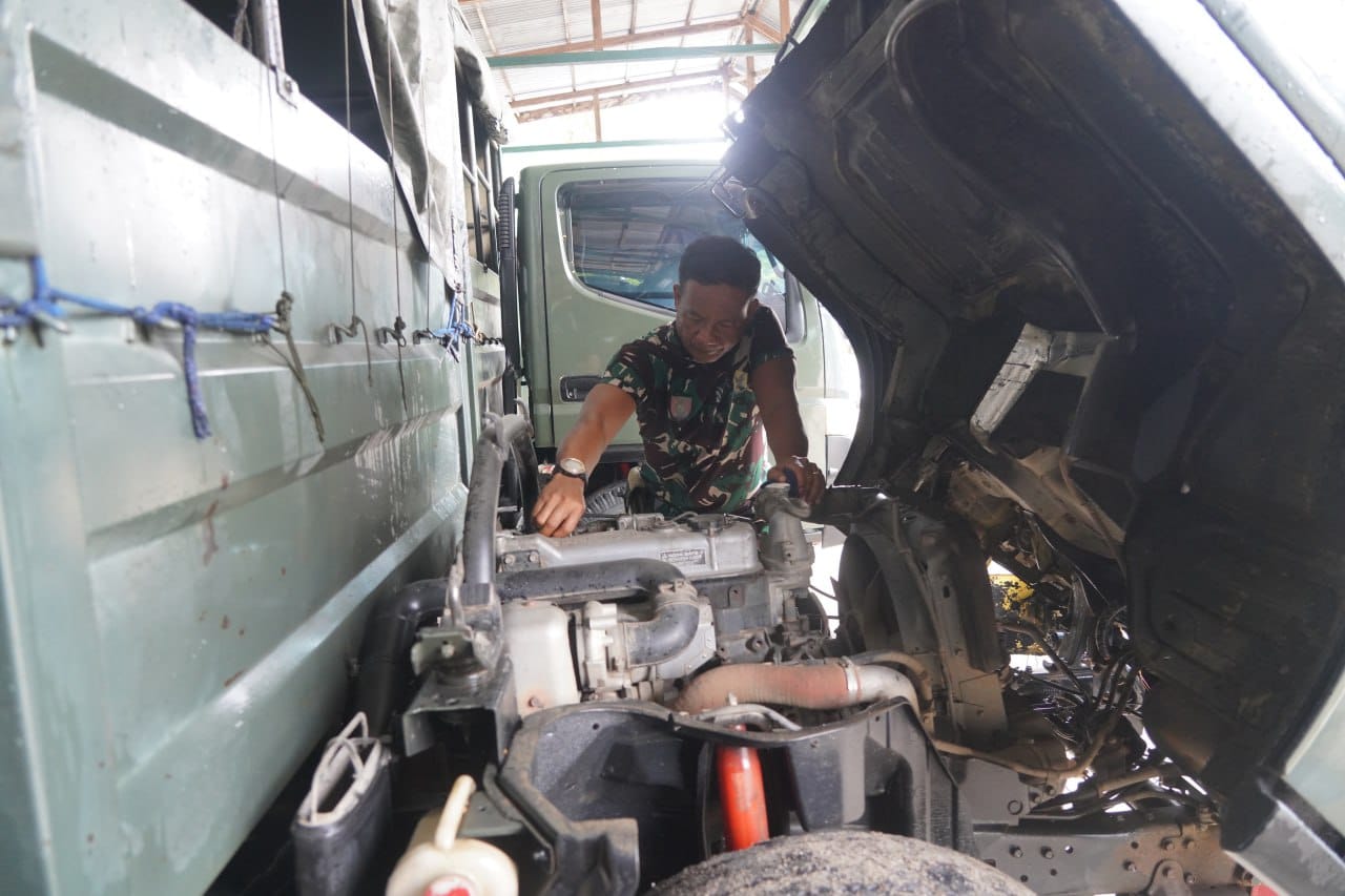 Sintang, Dalam rangka menunjang tugas pokok satuan, Korem 121/Abw melaksanakan pemeliharaan dan perawatan kendaraan angkut pasukan di Garasi Angkutan Korem 121/Abw, Jl. Pangeran Kuning, Sintang, Kalimantan Barat, Senin (13/11/2023).
