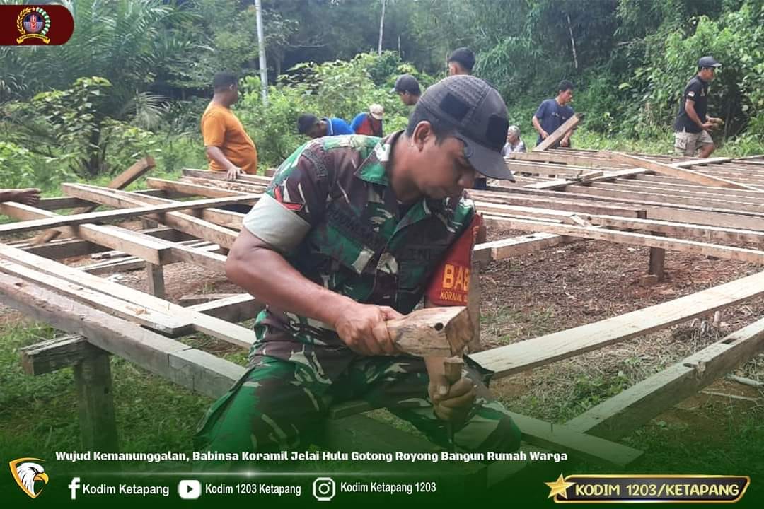 Ketapang – Bersama warga desa Kopda Rudini Babinsa Koramil 1203-14/Jelai Hulu bergotong royong membantu pengerjaan pembangunan rumah milik bapak Loga di Desa Tebing Berseri, Kec. Jelai Hulu Kab. Ketapang. Sabtu (11/11/2023)