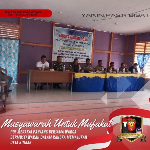 Satgas Pamtas RI-MLY Yonarmed 10/Bradjamusti Pos Merakai Panjang diundang menghadiri acara Musyawarah Penyusunan Rencana Kerja Pemerintah Desa TA 2024 diikuti aparat Kampung, Tokoh adat, Tokoh AgamaTokoh Pemuda,Camat Puring Kencana,Kades Merakai Panjang,Danramil ,Kapolsek,Ketua Puskesmas,Ketua BPD,bertempat di Balai Desa Merakai Panjang,Kec. Puring Kencana,Kabupaten. Kapuas Hulu, Kalimantan Barat,Selasa (21/11/2023).
