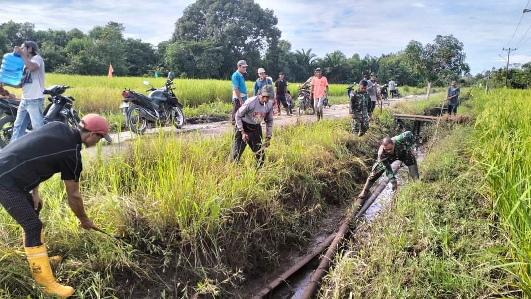 Sambas – Wujud kemanunggalan TNI Rakyat Babinsa Sulung Sertu Miswal Babinsa Sulung beserta 3 orang Anggota melaksanakan Karya Bakti/ Gotong Royong bersihkan jalan dan parit bersama sama dengan Forkopincam yang berlokasi di Dusun Sebataan, Desa Sulung, Kec, Sejangkung, Kab. Sambas, Sabtu (23/12).