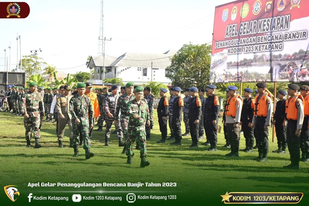 Ketapang – Mengantisipasi terjadinya bencana banjir, Kodim 1203/Ktp bersama stakeholder terkait melaksanakan apel gelar kesiapan penanggulangan bencana banjir tahun 2023 yang berlangsung di Makodim 1203/Ketapang, Rabu (27/12/2023).