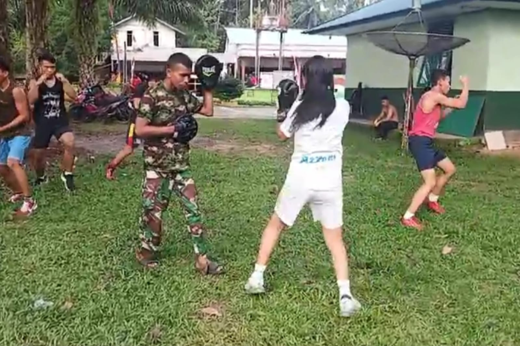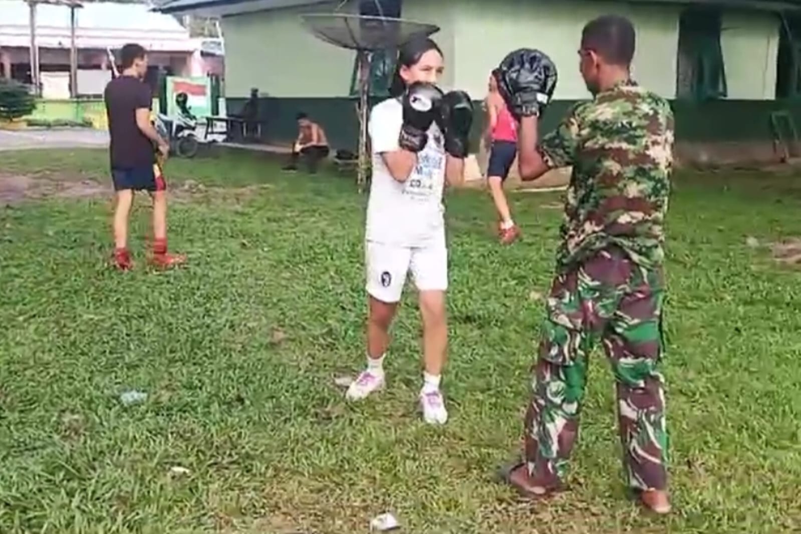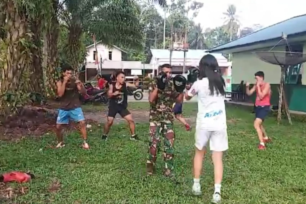 Setiap pagi pada hari libur Kopda Yohanes memberikan latihan dasar tinju di antara pemuda ada satu wanita yang mengikuti latihan tersebut dengan peralatan yang kurang memadai