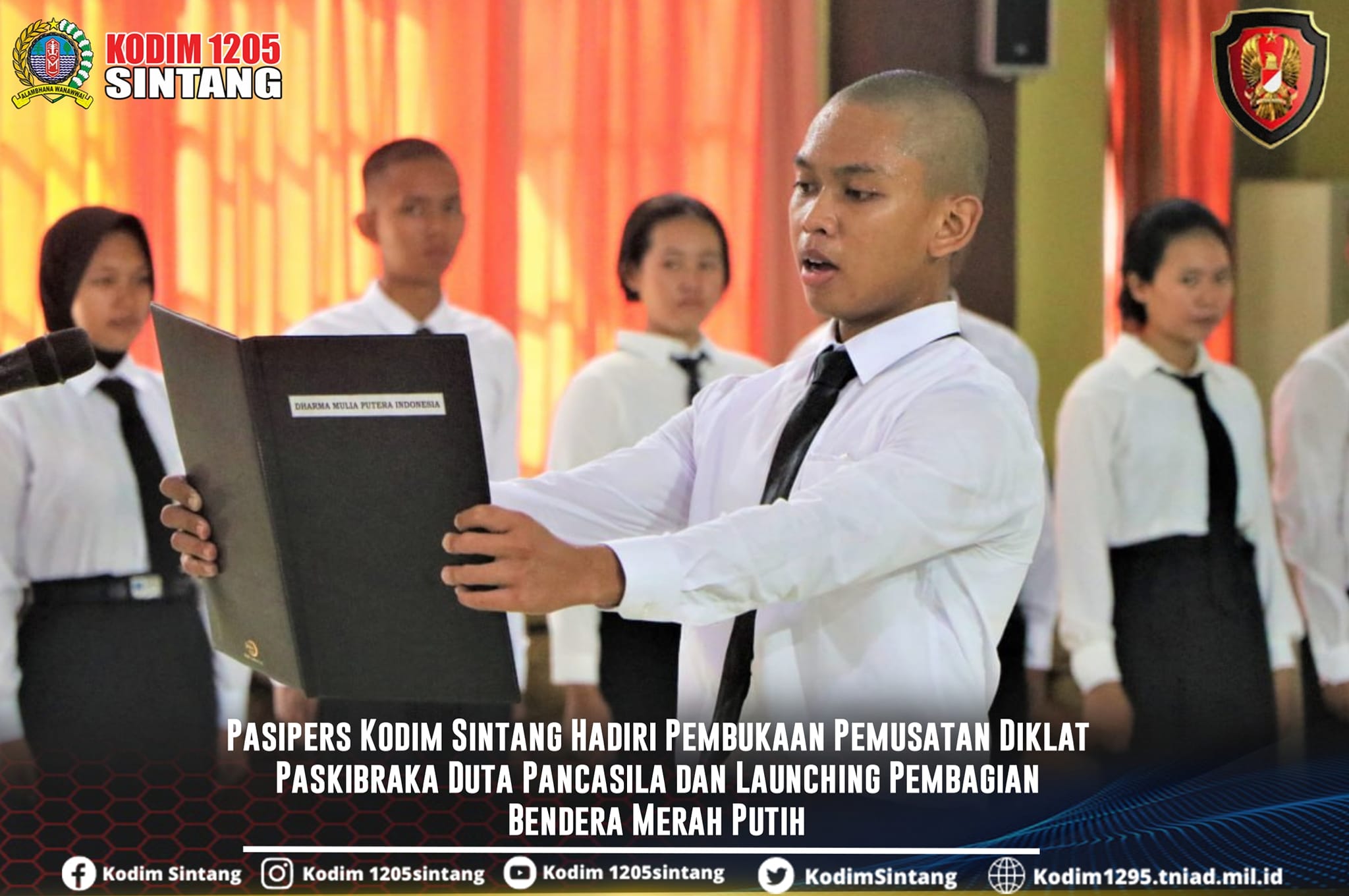 Sintang – Mewakili Dandim, Perwira Seksi Personil (Pasipers) Kodim 1205/Sintang, Lettu Inf Witono, menghadiri kegiatan Pemusatan Diklat Paskibraka Duta Pancasila dan Launching Pembagian Bendera Merah Putih Kabupaten Sintang, dalam rangka menyambut HUT Kemerdekaan Republik Indonesia ke-79 Tahun 2024, Rabu (31/07/2024).