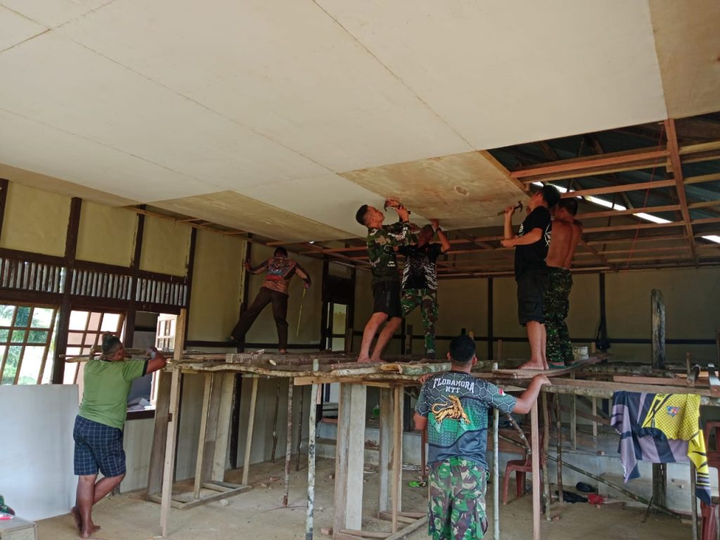 Proses pemasangan plafon ini dilakukan dengan cermat oleh anggota Satgas TMMD. Bekerja secara terorganisir dan efisien untuk memastikan bahwa setiap langkah dalam pasangan plafon dilakukan dengan baik.