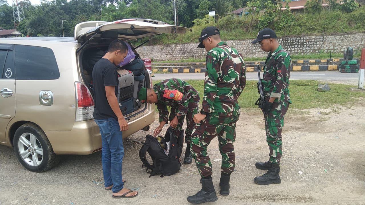Mencegah terjadinya Penyelundupan Barang Ilegal yang dapat melewati Perbatasan, Koramil 1204-21/Entikong bersama personel Pamtas RI-MLY melaksanakan pemeriksaan terhadap setiap kendaraan yang melintasi daerah perbatasan.