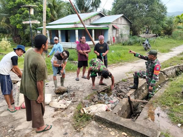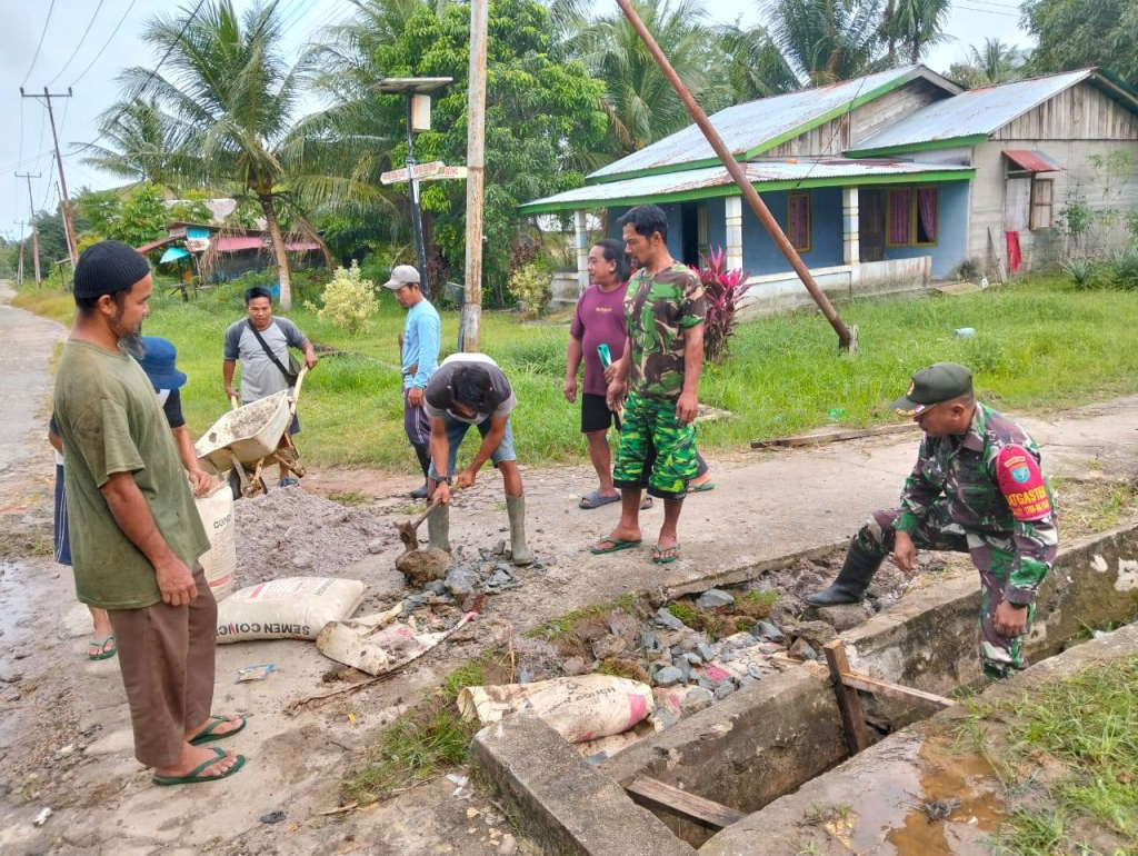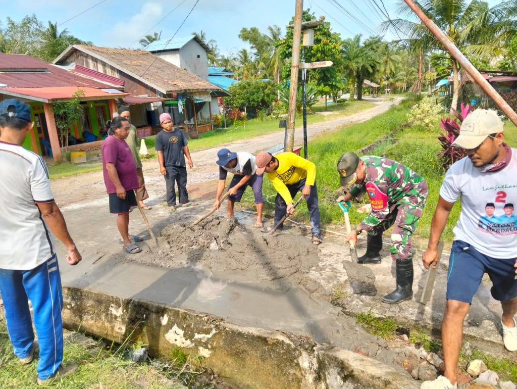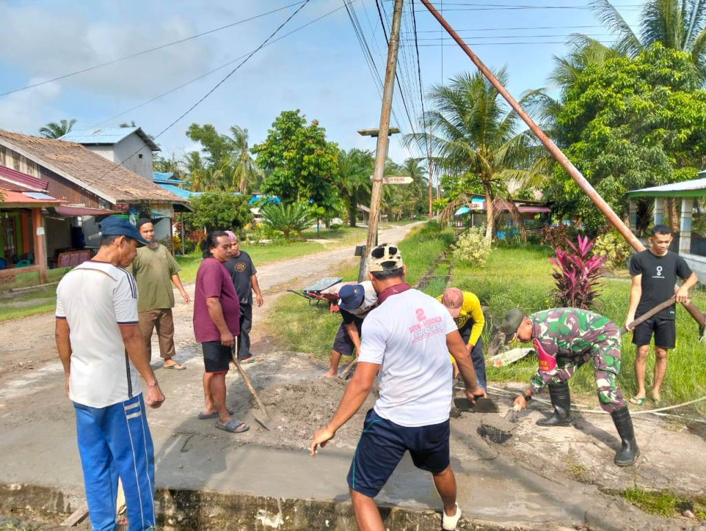 Sambas – Bantu kesulitan masyarakat serta ikut mendukung percepatan pembangunan wilayah Serda Handy Sulistyo Babinsa Temajuk Koramil 1208-08/Paloh. bersama warga gotong royong cor jalan dan memperbaiki saluran Got yang dilaksanakan di Desa Temajuk, Kec. Paloh, Kab. Sambas. Minggu (09/02/25).