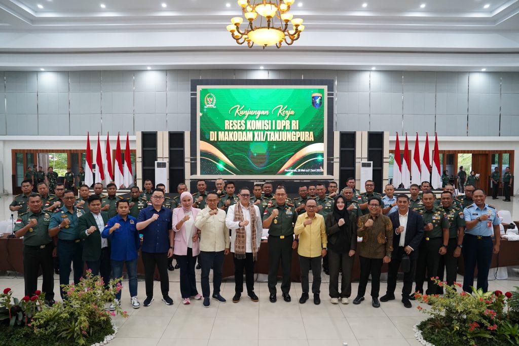 Kubu Raya – Kasiter Kasrem 121/Abw Kolonel Inf Mordechai Triyandono, S.I.P., mewakili Danrem 121/Abw Brigjen TNI Purnomosidi, S.I.P., M.A.P., M.Han., turut menyambut kunjungan reses Komisi I Dewan Perwakilan Rakyat Republik Indonesia (DPR RI) di Aula Sudirman, Makodam Tanjungpura, Jalan Arteri Ali Anyang, Sungai Raya, Kubu Raya, Rabu (28/5/2025).