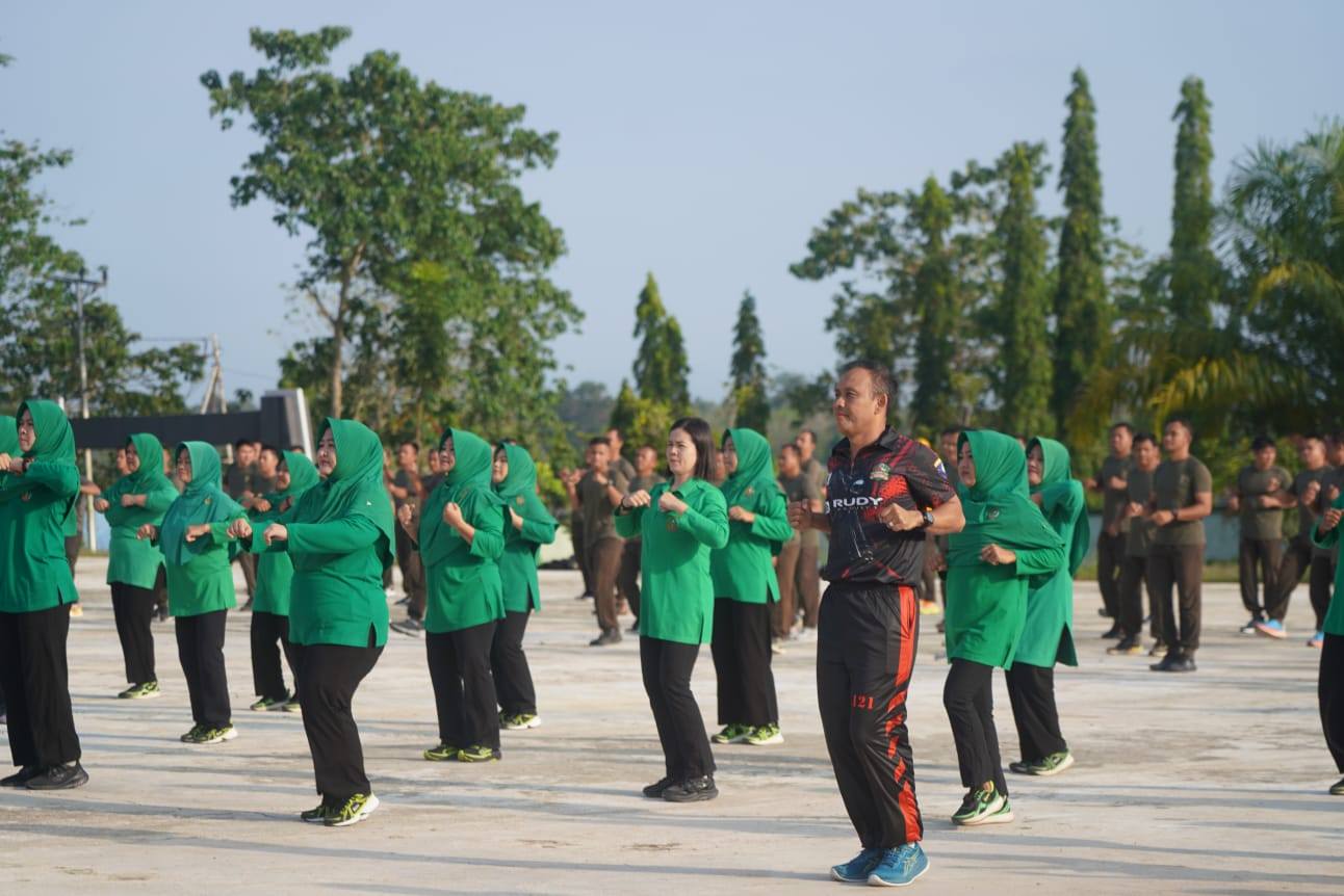 Sintang – Danrem 121/Abw Brigjen TNI Purnomosidi, S.I.P., M.A.P., M.Han., bersama Ketua Persit KCK Koorcab Rem 121 PD XII/Tanjungpura Ny. Deby Purnomosidi, mengajak para prajurit, PNS, dan anggota Persit di Korem 121/Abw untuk berolahraga bersama melalui senam aerobik, Selasa(10/06/2025) pagi.