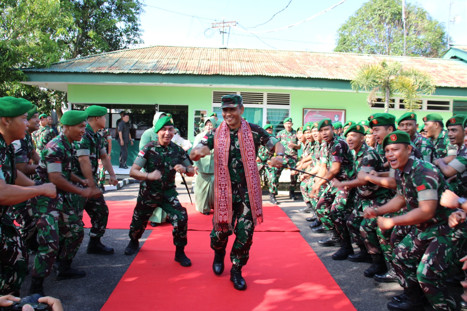 Kedatangan Danrem 121/Abw beserta rombongan disambut hangat dengan prosesi budaya khas Dayak, termasuk tarian tradisional khas Dayak, yang menambah semarak suasana.